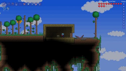 Terraria:Undeluxe Edition 旧仕様あれこれ 話には聞いていたんですがマジでこのバージョンの空島って土でできてるんだ……一発目で蹄鉄が手に入ったのでヘルベーターの安全性が確保されました。やったね。 1ブロック未満の薄く敷かれた溶岩でアイテムは燃えな…